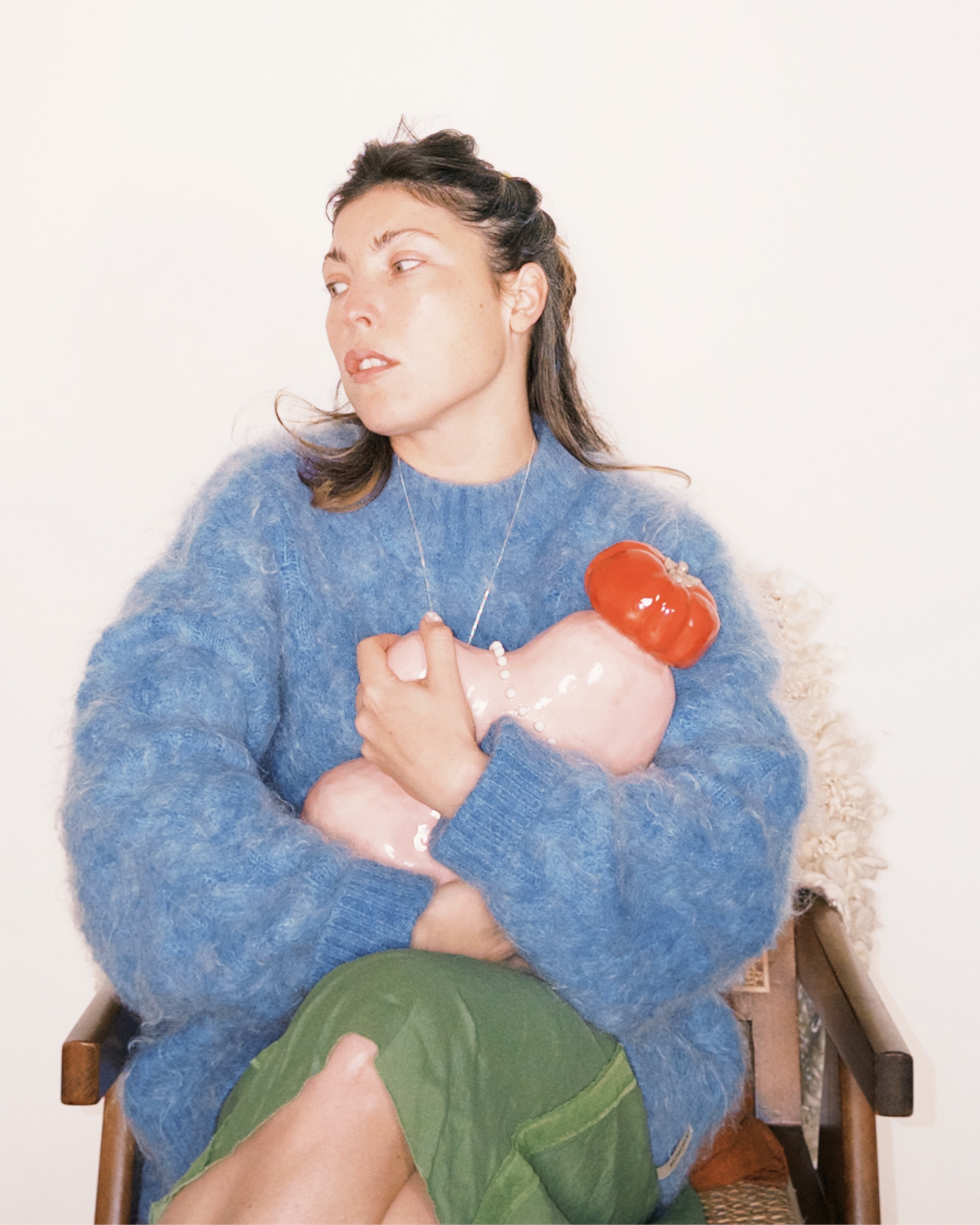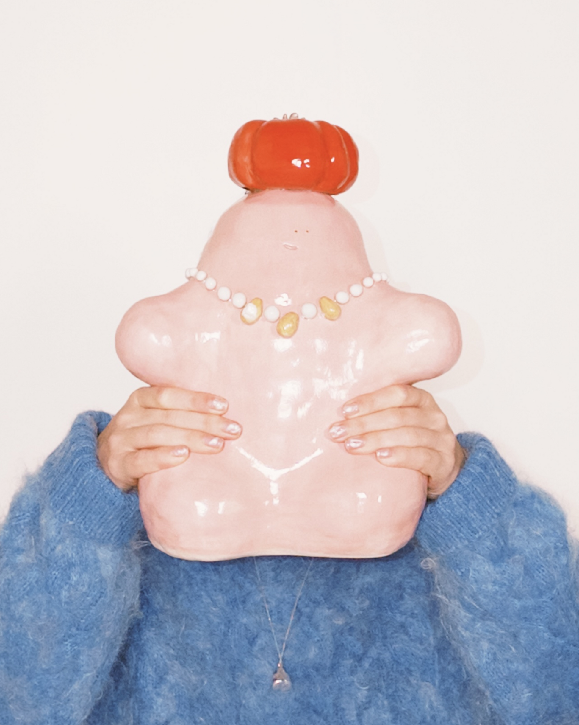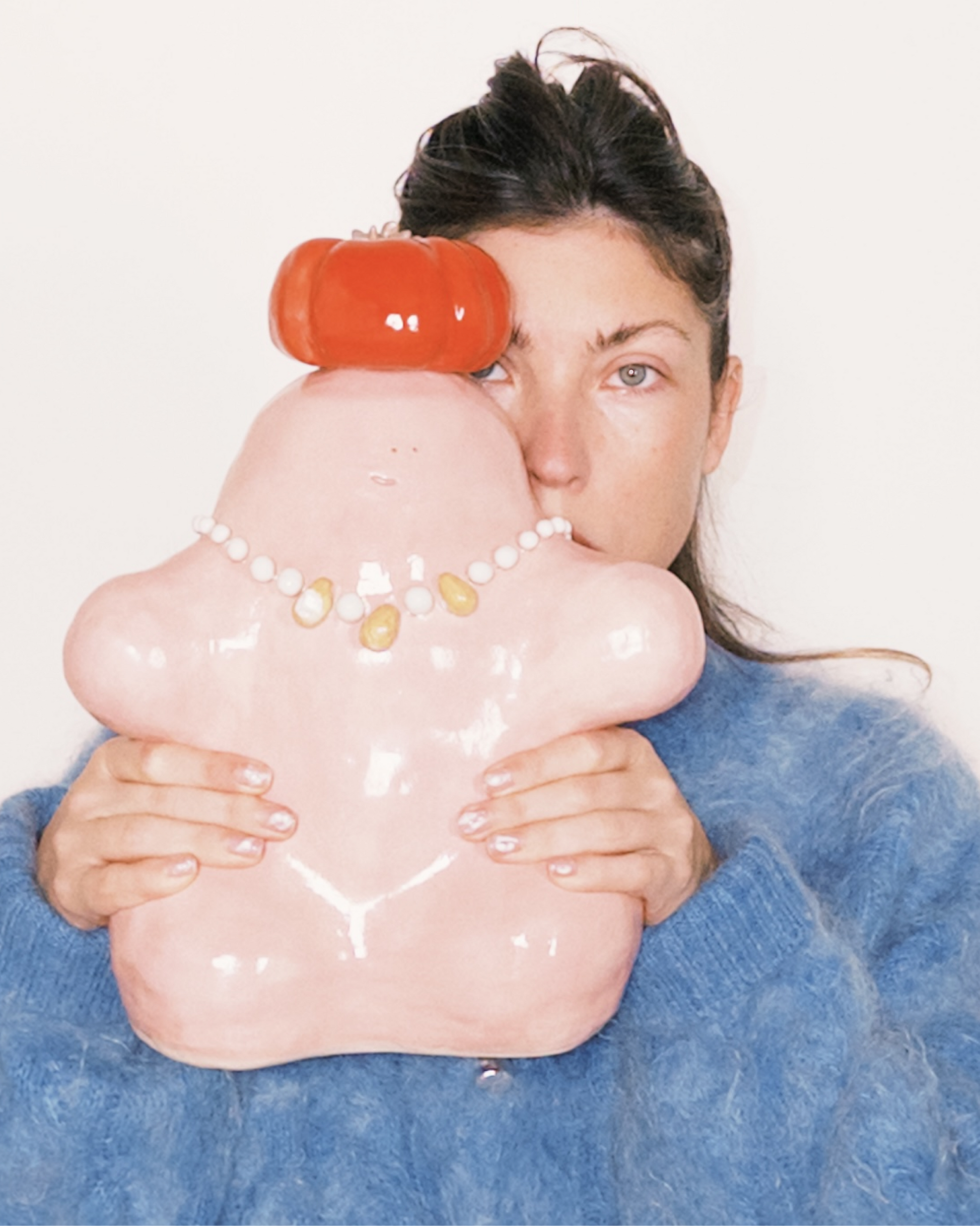 Heavy, pink, crowned with a tomato and dressed in pearls & pears, it doesn’t try to be strange — it simply is, radiating a quiet absurdity that steadies the room. Serious in its unseriousness, the Oracle shifts the atmosphere just by existing, until everything around it feels softer, slower, and a little more enchanted.